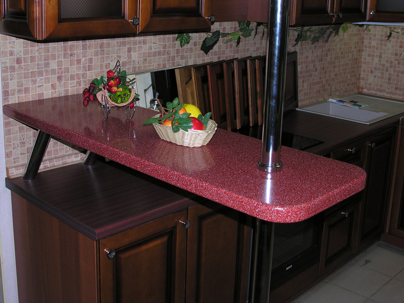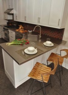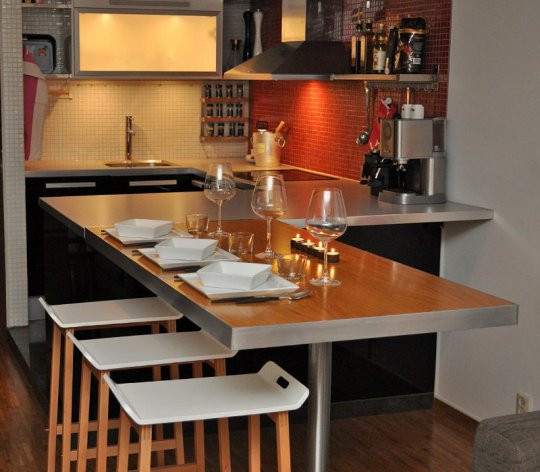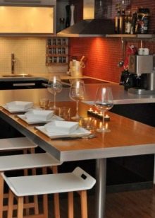 An interesting design boasts a corner bar tables. As a rule, the width of such models does not exceed half a meter. The basis of such options is often supplemented by built-in wardrobes and shelves. In such equipment you can store dishes and kitchen utensils.