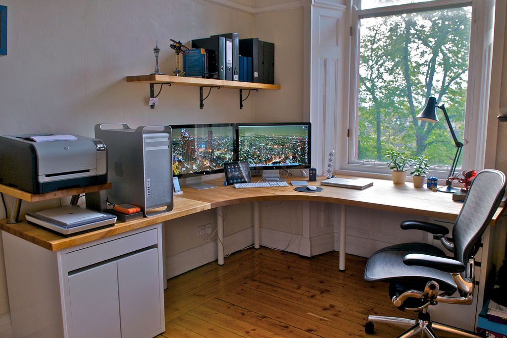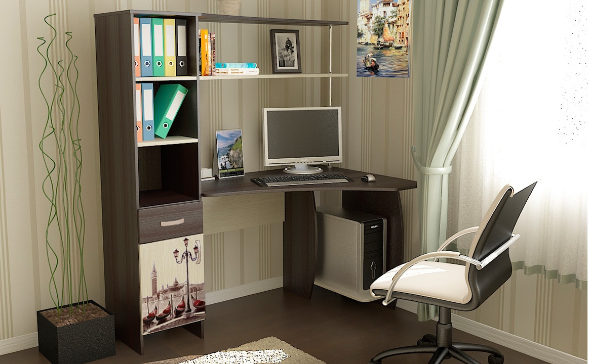For a computer or laptop is better to buy a table designed to accommodate such items. As a rule, in such cases there is a separate compartment for the system unit and various office equipment. Such tables are suitable not only for the home, but also for the office. The corner table can be equipped with a cabinet and drawers. Such models are suitable not only for work, but also for study, since they can accommodate the necessary papers, books and textbooks.