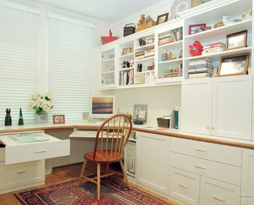 The snow-white corner table-sill can be placed in a bright room and supported with open wall shelves near the near wall. In this way you will get a very spacious and spacious work area in which many necessary things fit.