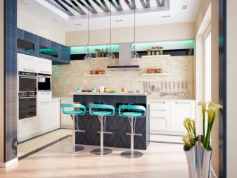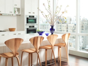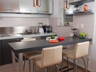 Bar stools are often sold complete with kitchen furniture. They can be made individually, under the order. As a rule, high bar tables look beautiful with wooden stools, covered with leather.For lovers of high-tech style, tall chairs are suitable for a simple, but at the same time, strict form, decorated with fabric in gray and black shades.