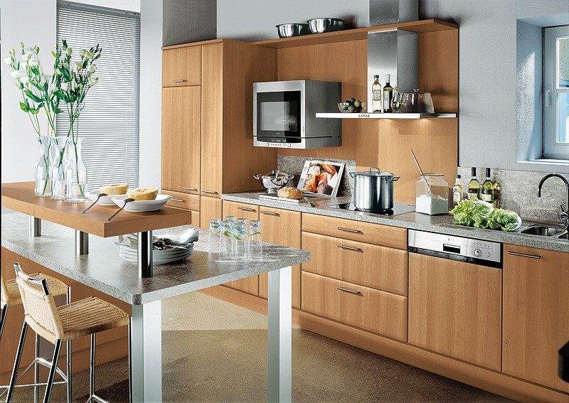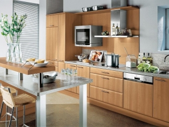 It is worth noting that the tree is “afraid” of sudden changes in temperature, and it should not be installed near an open flame. These tables must also be protected from scratches and mechanical damage. When purchasing such products for the kitchen, you should choose a table top of well-dried wood. A good alternative to wood is laminated chipboard material. It is inexpensive and quickly selected for any style of cuisine.
