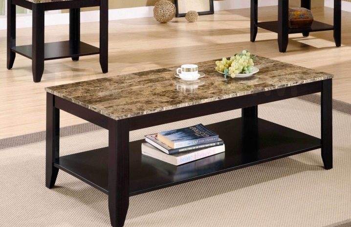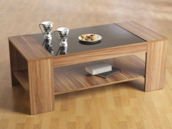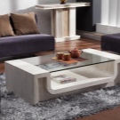 The table top and base are made from a variety of materials. Expensive products are made of solid wood and even semi-precious stone. There are more budget products for the manufacture of which are plastic, chipboard, MDF, veneer, glass, metal. The tables are made of any one type of materials, and the combined models combine two or more different types. A very durable version of the coffee table is made of natural materials - wood with stone decor. Of course, this is an expensive model, but it fits perfectly into the classic interior, and country style, as well as retro.