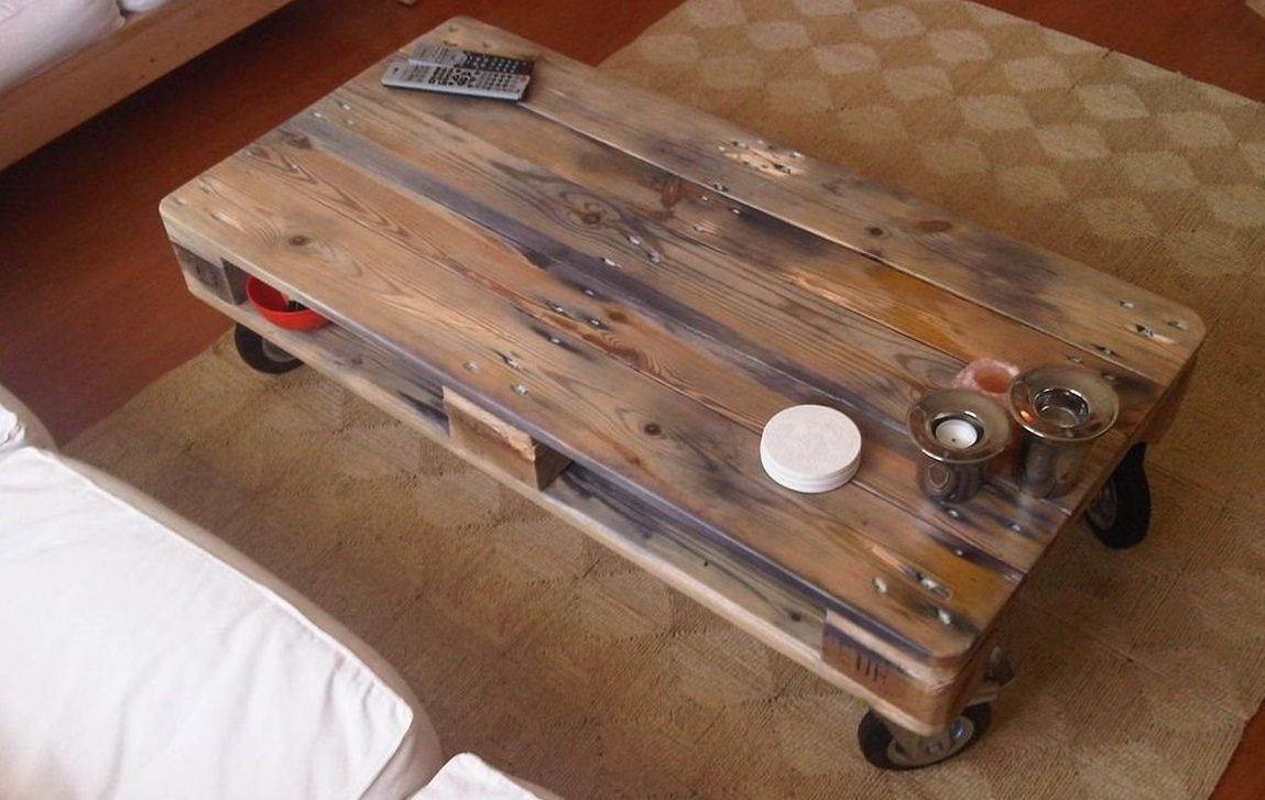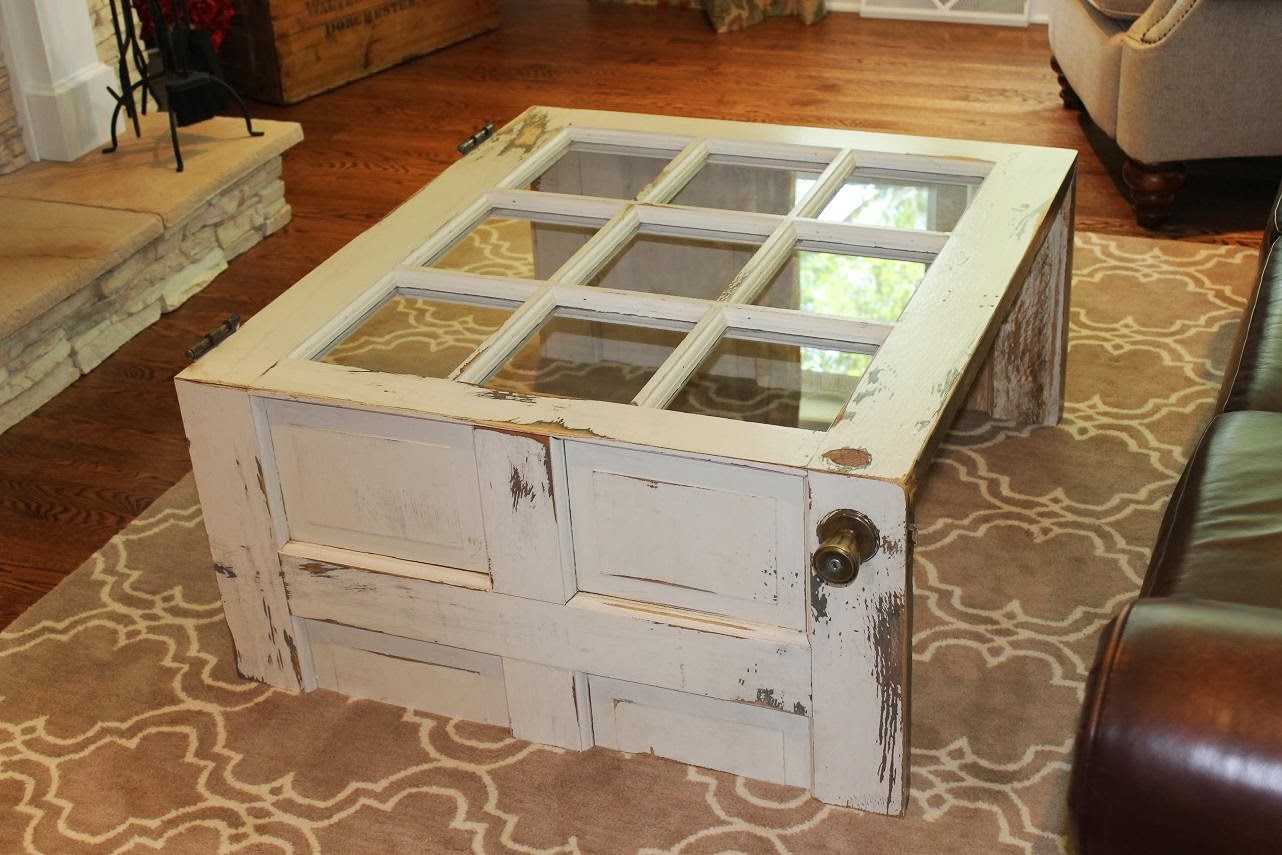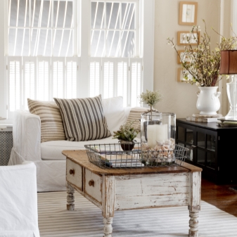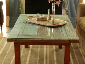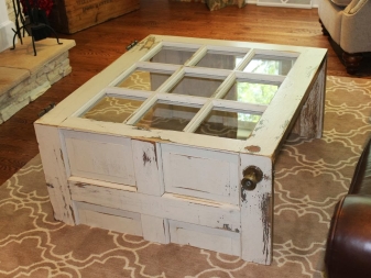 Anything can turn into a small coffee table. For example, a wooden door leaf, removed from its hinges, to which legs were added. The old paint is deliberately not cleaned, but on the contrary, varnished, keeping the “traces of time”. You can leave the lock or handle. By analogy, as a tabletop, you can take a wooden window, putting tempered glass in a frame.
