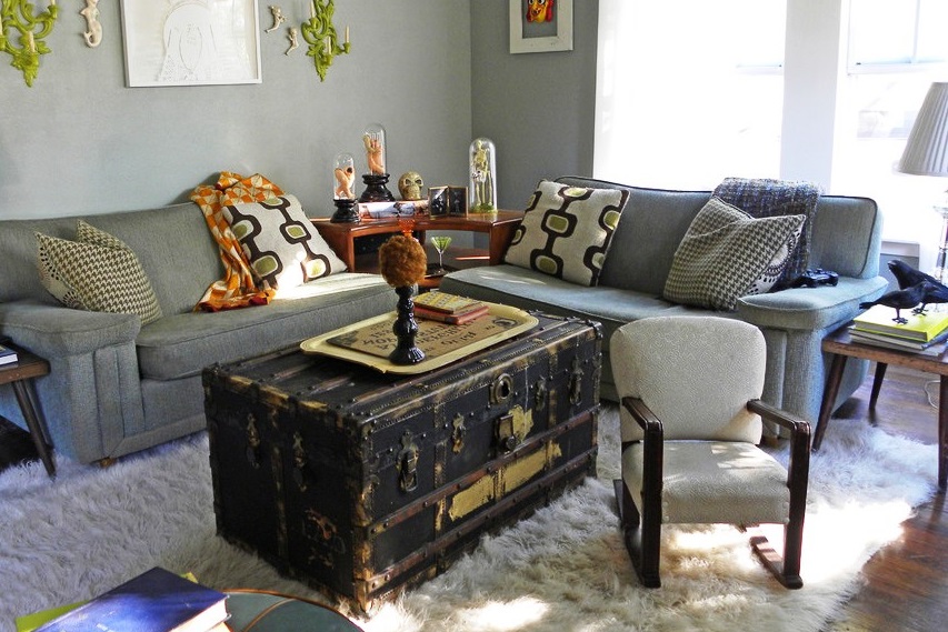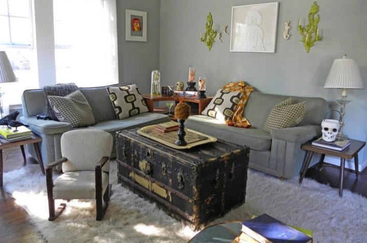 Tables chests fit well with the style country or classics. Sometimes the role of the coffee table is played by a real chest. This creates additional convenience, because inside you can arrange a system for storing a variety of items, as well as arrange a home bar.