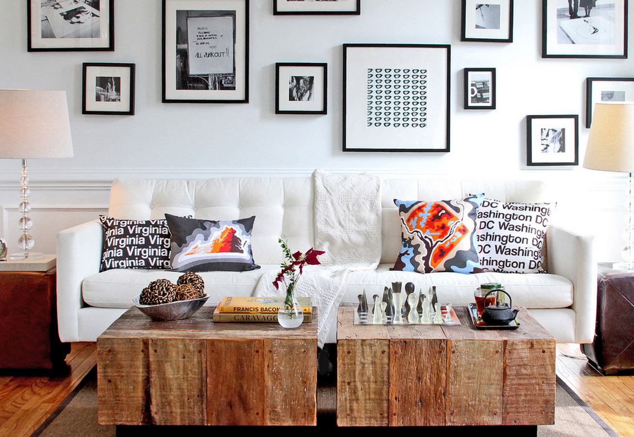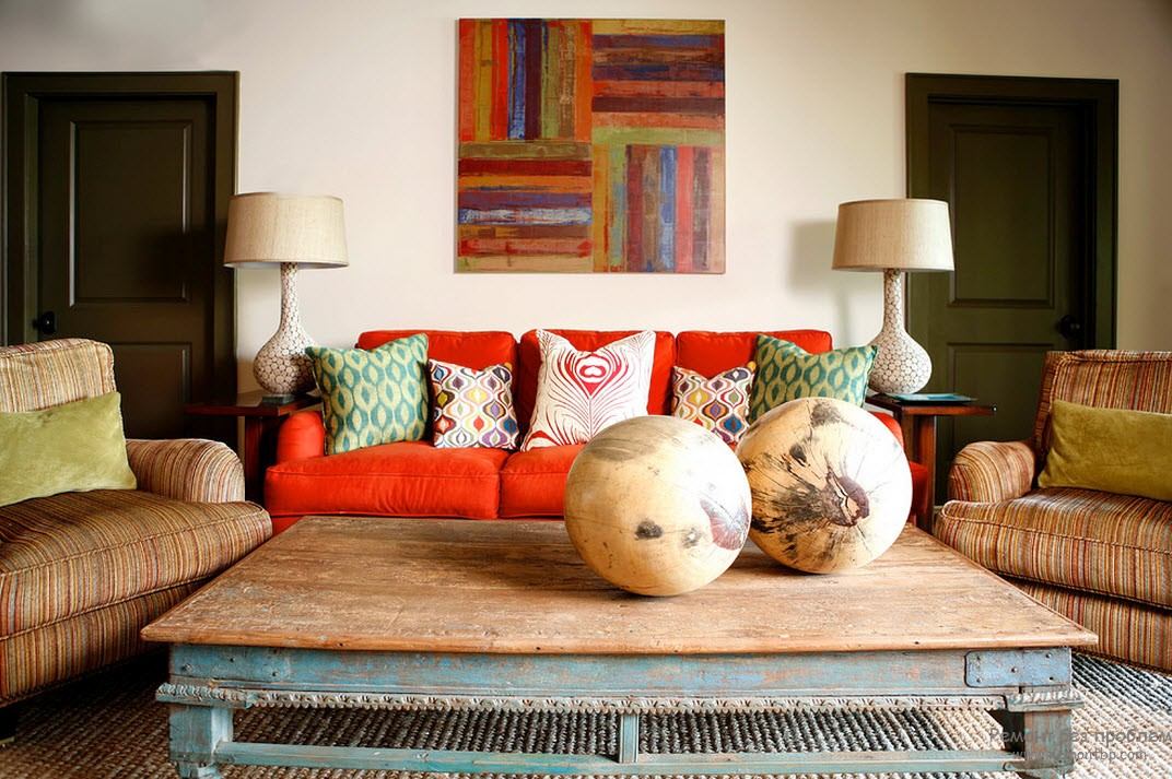 Often, designers use the pairing technique, which sometimes gives unexpectedly positive results. So, choose lamps, vases, rugs, as well as coffee tables. These items must be absolutely identical. This approach contributes to the creation of the original interior, convenience and quick change of furniture: you can move them together and form a large surface, for example, when receiving a large number of guests. In very large rooms there may be a greater number of identical tables.