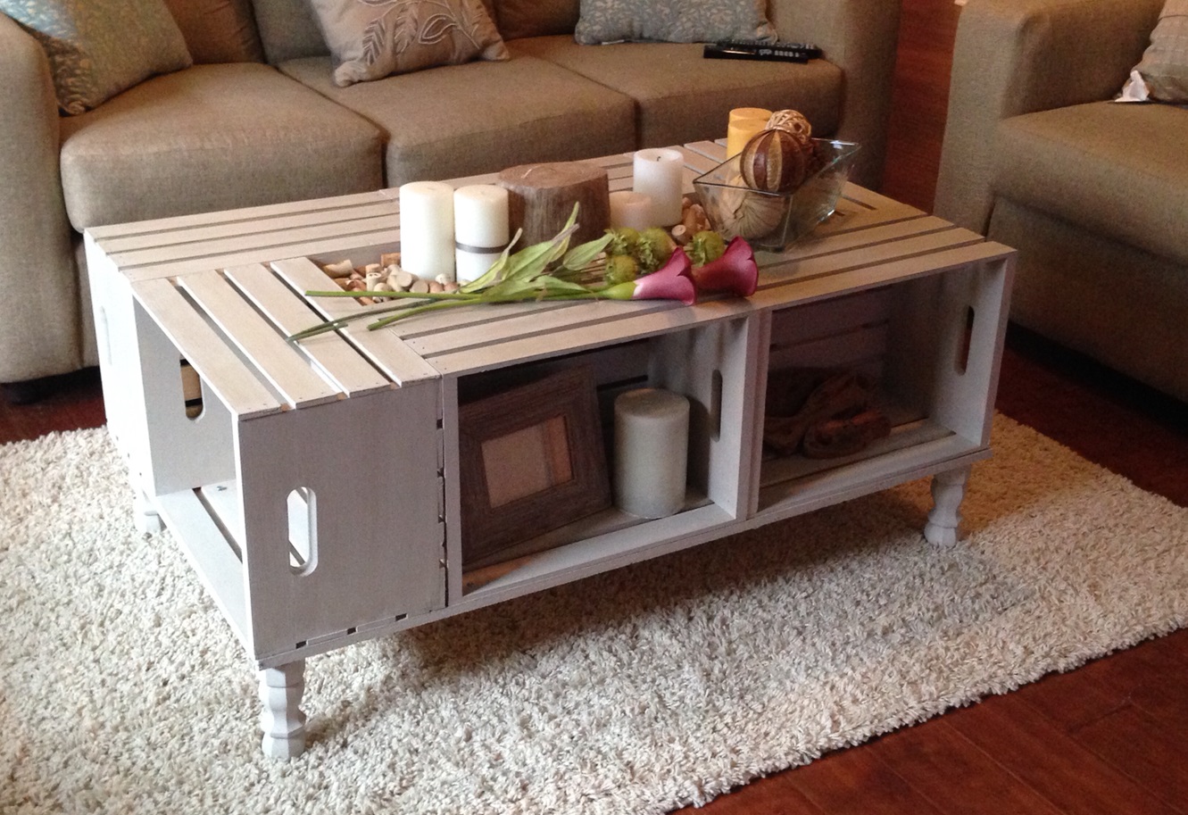 Simple wooden boxes can be used for the table, as a designer. Of the six boxes, you can make a good functional coffee table, which will accommodate books, albums and CDs. It is only necessary to apply a layer of high-quality paint that will transform the old boxes beyond recognition.