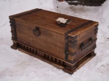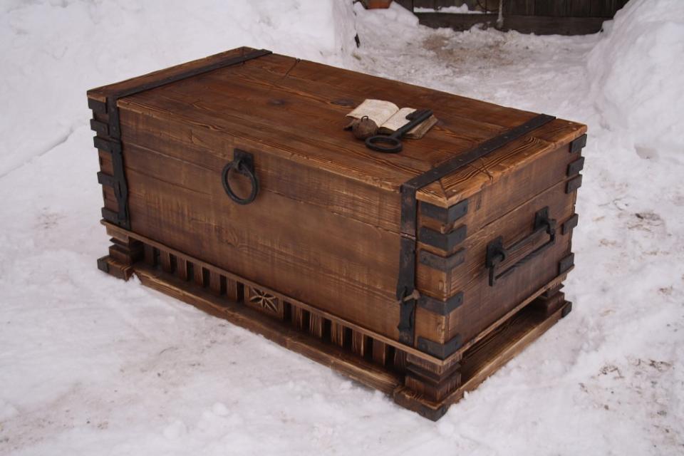 The table can also be made in the form of a chest.And even more original solution would be to use a real vintage chest as a coffee table - this is very stylish as well as convenient, since you can store a variety of personal belongings in the chest or organize a mini-bar inside it.