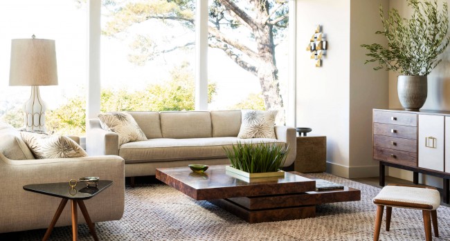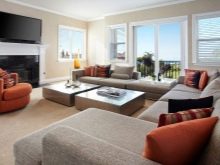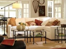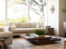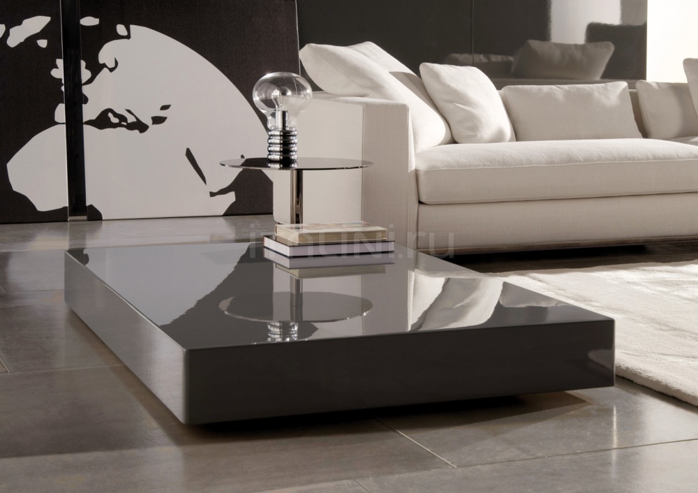 Another interesting trick is setting in the living room low coffee tables. Their height should be no more than 30 centimeters. Such products differ in laconic forms and clarity of angles. Table legs are often absent, the color palette is restrained.