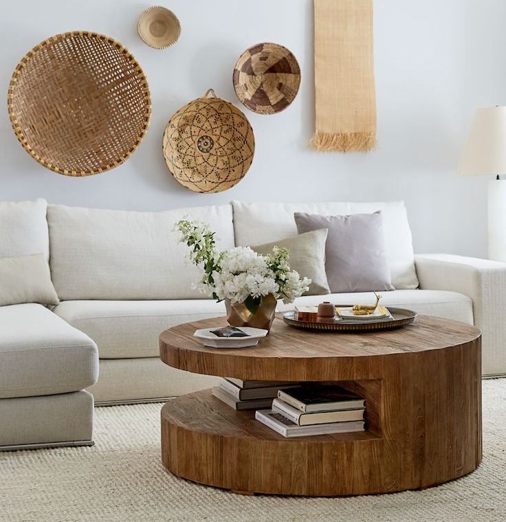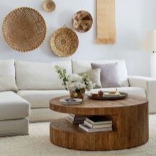 The round-shaped coffee table looks stylish and unusual, with niches for storing various things below. The simplest and at the same time very original table in eco style It looks like a slice of a whole tree trunk. Wickerwork from a rod or a rattan also interestingly look.