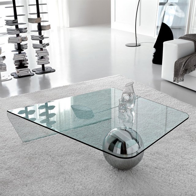 Original and creative look models of tables, the surfaces of which have the shape of irregular quadrangles. Especially stylish and fresh, these products will look in combination with bright carpet and furniture. An interesting option for the interior in bright colors can be a very creative glass table, one side of which, as it leans on a shiny steel sphere.