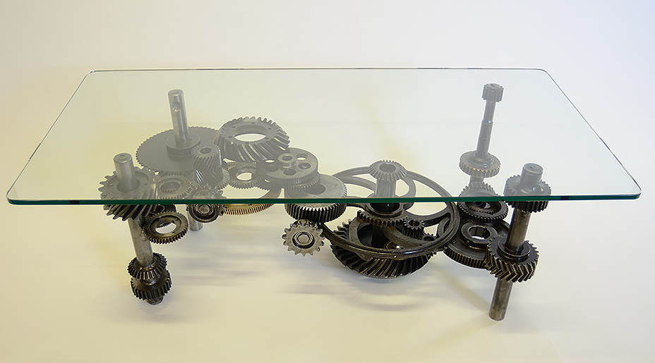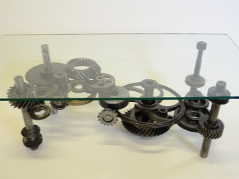 - A stunning unusual table with a glass surface and black metal gears in the lower part will decorate any interior in this style.