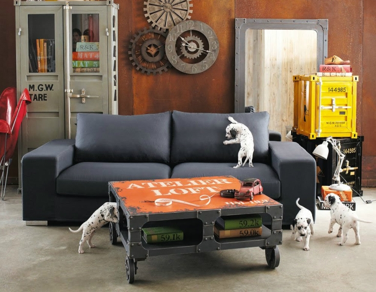 - One of the most frequent guests in the industrial loft is a magazine pallet table. It can be either painted and processed, for example, a glass panel covered on top, which makes it look like a standard coffee table for a living room, or it can have a pristine appearance. It does not spoil it at all. This is one of the most original and economical options for housing, because you can decorate each pallet to your taste, and there is simply no second such item.