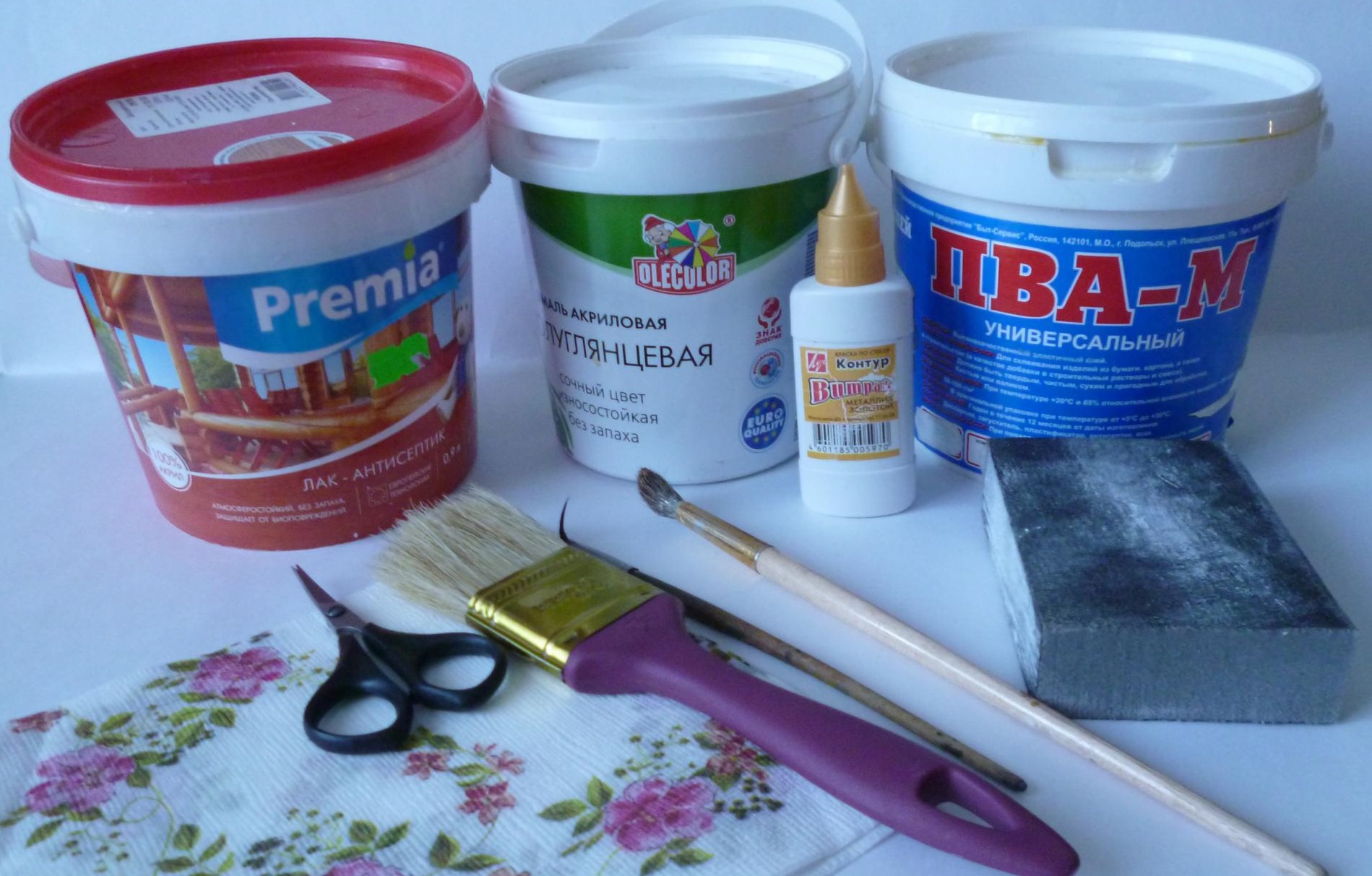 To fix the elements you will need PVA glue. Acrylic paint and primer are used for decoration and surface treatment. In the process you will need varnish, brushes and special stencils.