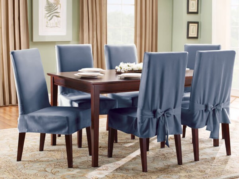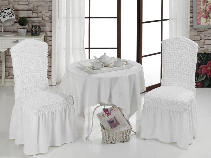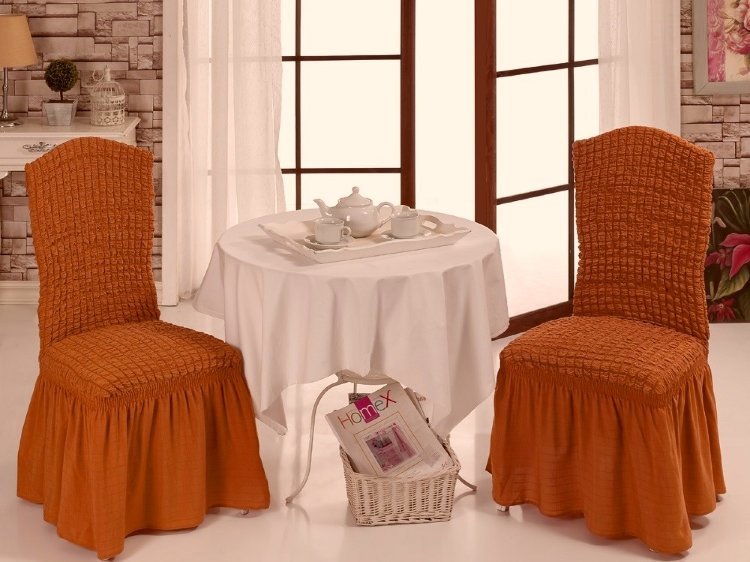 Design embodiments depend on the shape of the original furniture. Covers can be short, long and medium. Even the most simple and boring chair cover can decorate beyond recognition. And if a holiday suddenly appears, you can always decorate the chairs thematically absolutely under any style. Properly selected covers can turn your living room or cottage into a real restaurant.