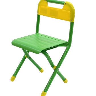 For kids, "Demi" is folding chairs, bright, light and safe. They are made of plastic, metal frame. Seat height - 34 cm. Maintain a weight of up to 30 kg. To make the chair comfortable to carry, there is a special handle on top. The angle of the backrest is designed so that the load on the spine of the crumbs is minimal. The stool is provided with protection against accidental folding, so that it is completely safe for the child.