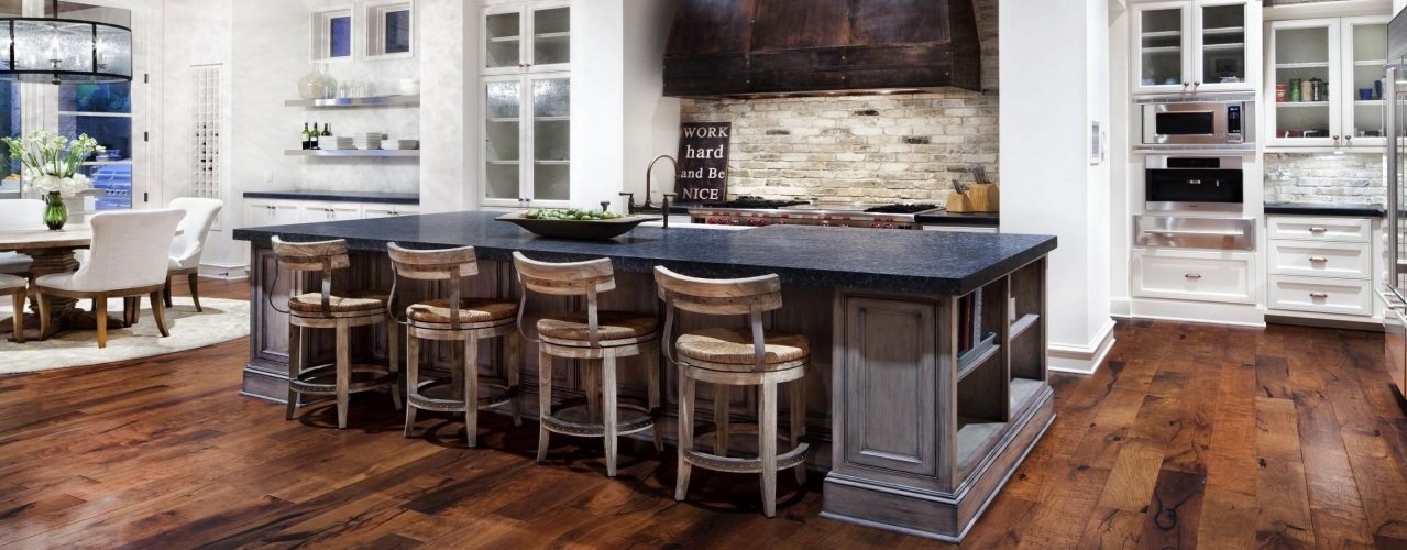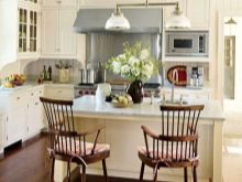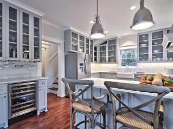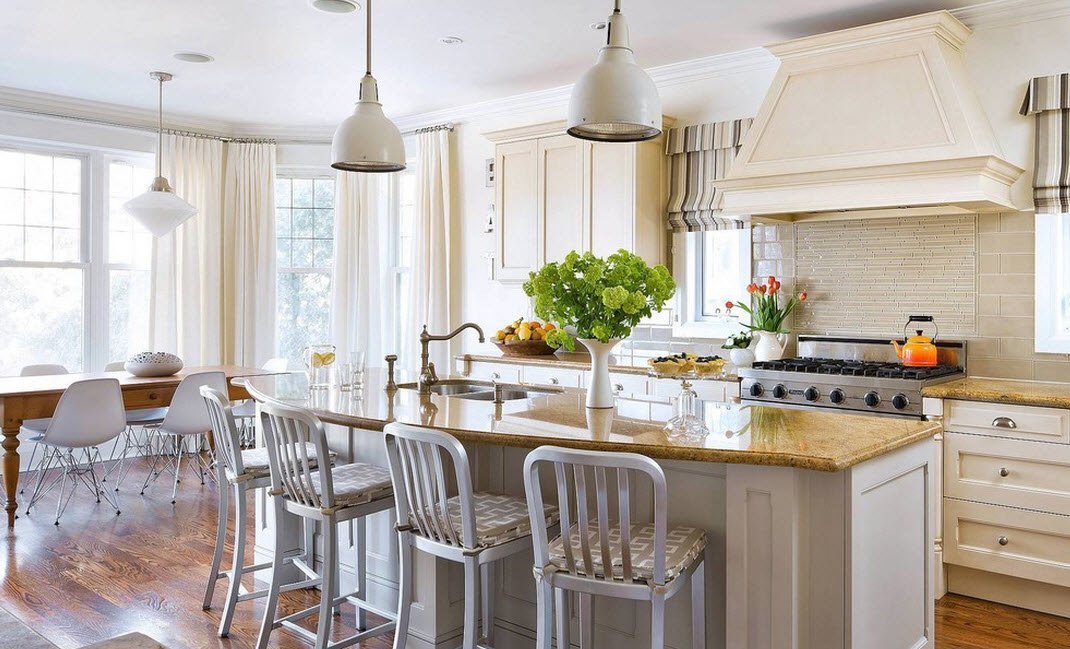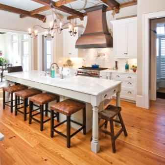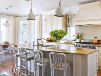 The use of unusual furniture, for example, high bar stools made of natural wood, will help to make a country-style kitchen more modern.