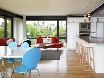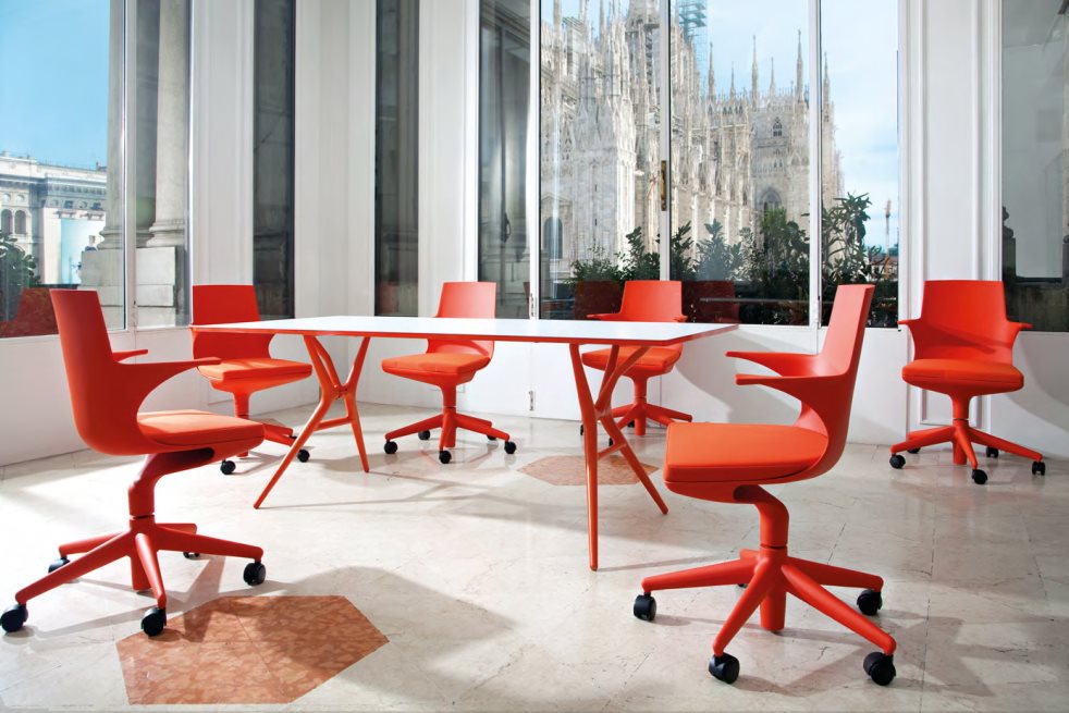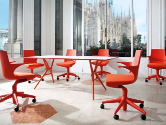 To give, they often acquire plastic structures that are very bright in color. So, purple and lilac models are popular.You can also pick up a red, orange, blue chair. Red chairs are very popular among the owners of apartments with an interior in a modern style. They perfectly complement the white and black tables and look very elegant. And this applies to models with leather upholstery, and ordinary plastic products.