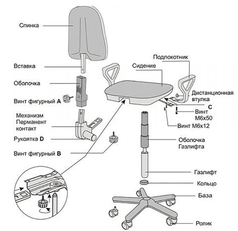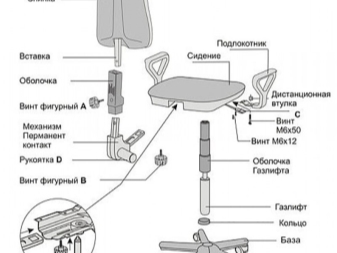 The most complex mechanism in office and school chairs. So, the swinging mechanism or the gas-lift enters their design.His device is presented in the form of a working gas cylinder, its body, ball bearing, steel washers. The bearing provides the ability to rotate the seat of the chair around its axis.
