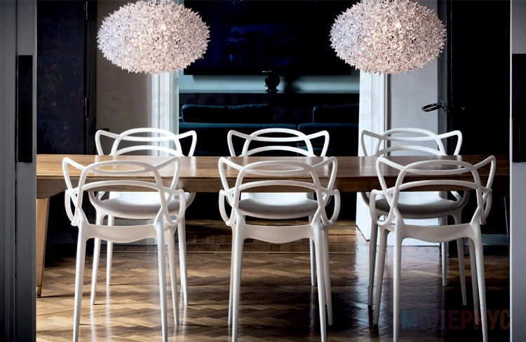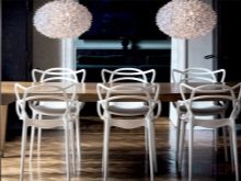 In addition to bright plastic chairs, you can often find transparent models. They will become an original object in a modern interior and a small apartment. The transparency of the design visually increases the area, fills the room with freedom and cleanliness.