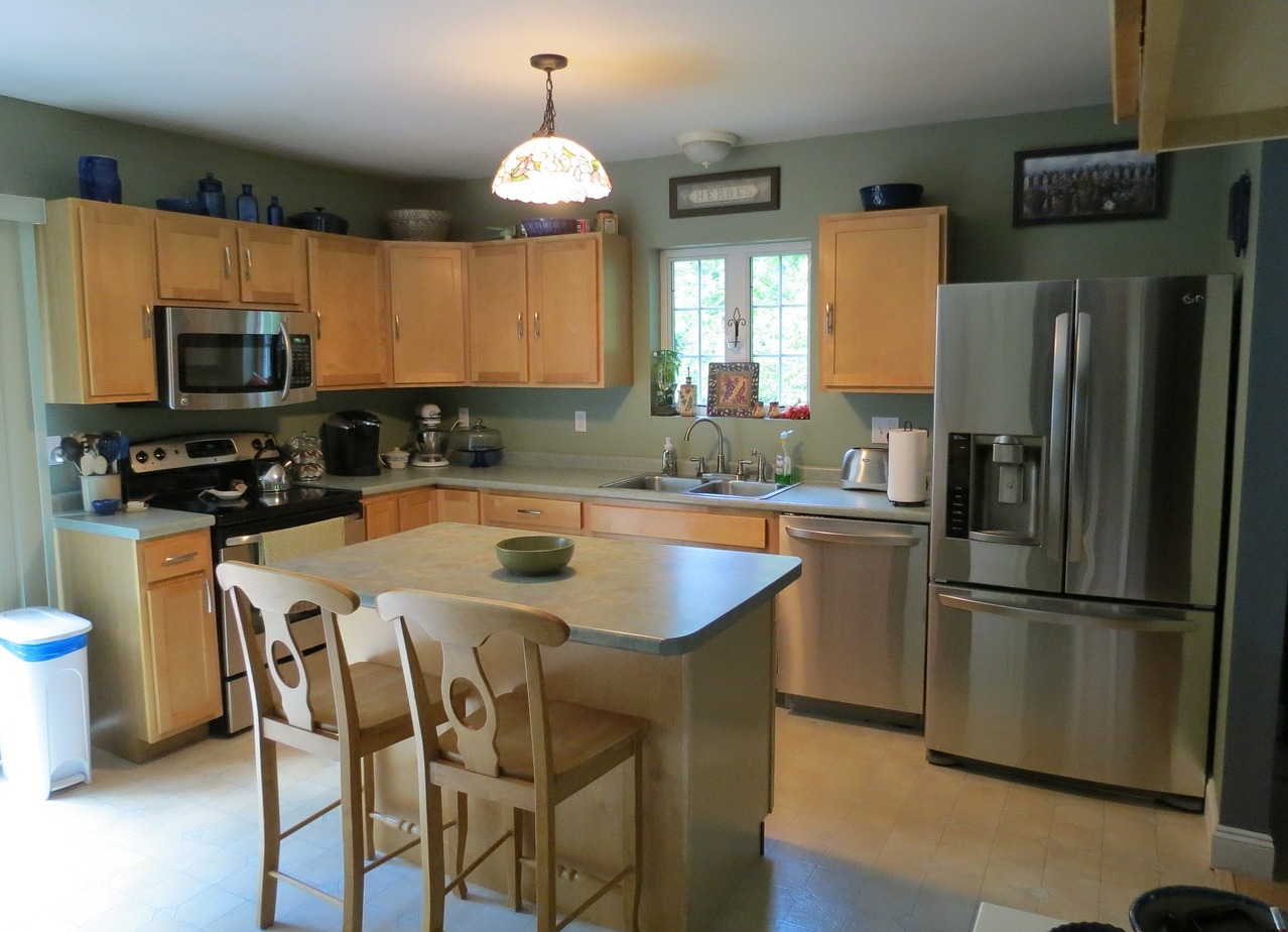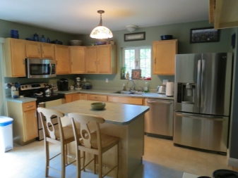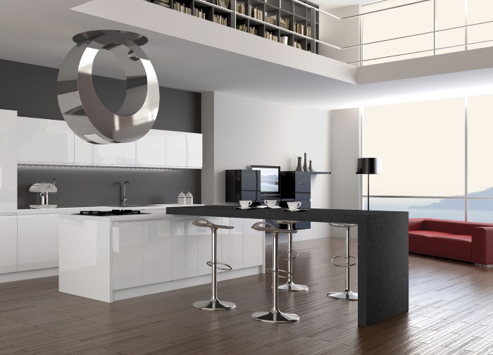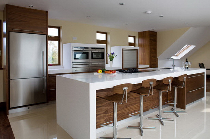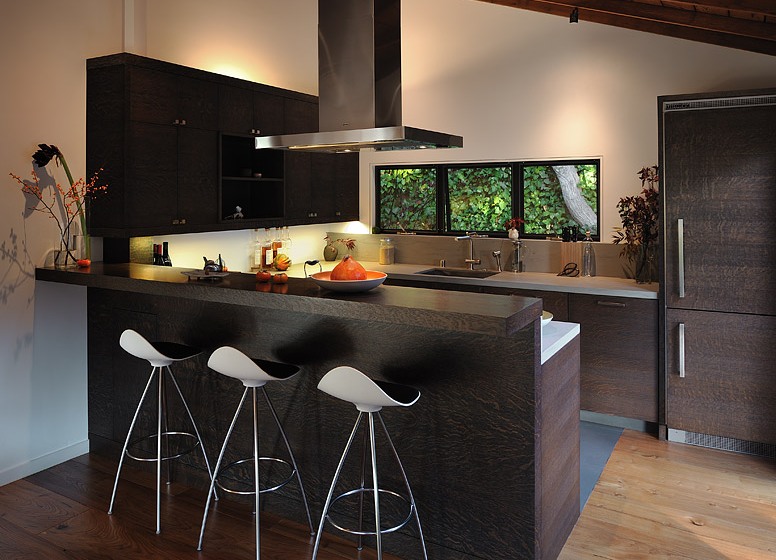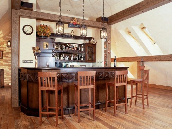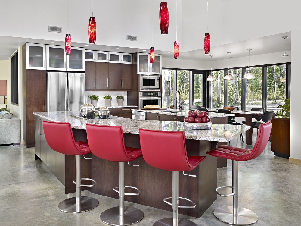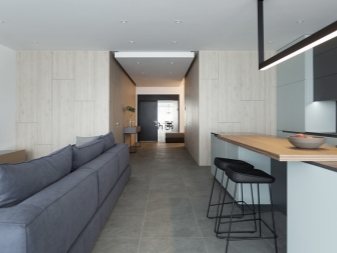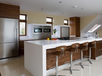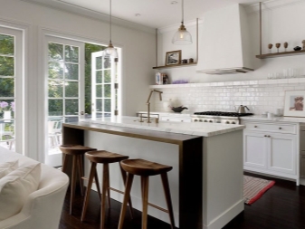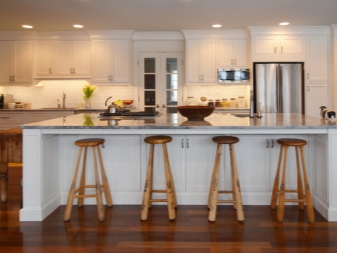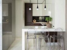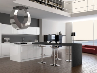 This design still has one drawback - a combination only with a bar or high table. Sitting on such furniture at a regular table would be extremely uncomfortable, and this combination looks inharmonious.