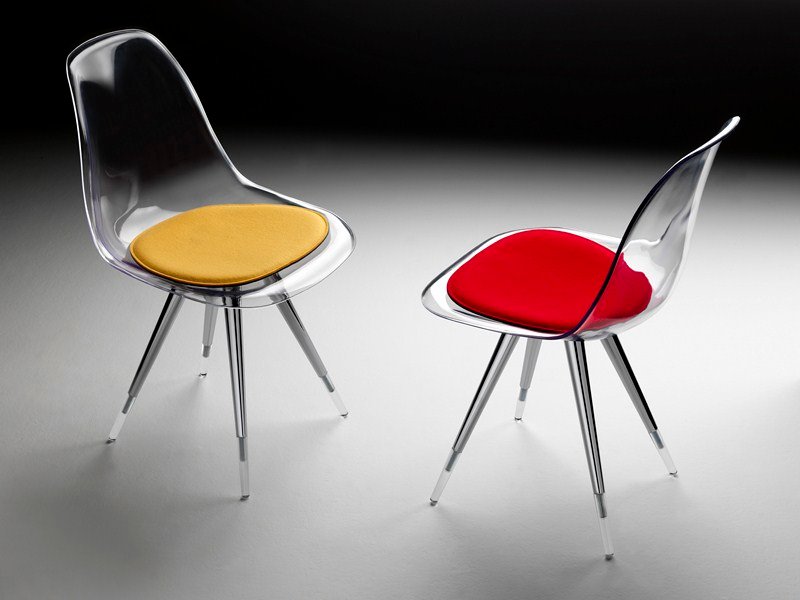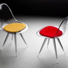 - With cushioned seats or extra trim.. Such options are characterized by greater comfort and convenience. The additions are textiles, leather trim. There are models and removable covers. As a result, these additions help the entry of a transparent chair model into any interior style.