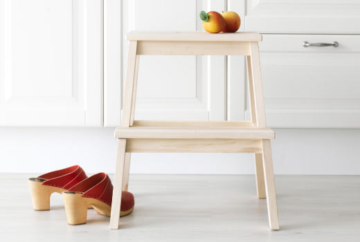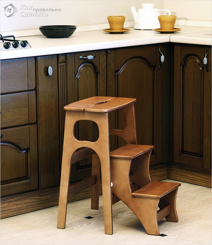 If you have a small kitchen in your apartment, a good solution would be to have a ladder-stool made of a material suitable for the color and texture of the kitchen. This is an unusual and versatile option.