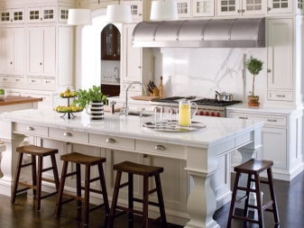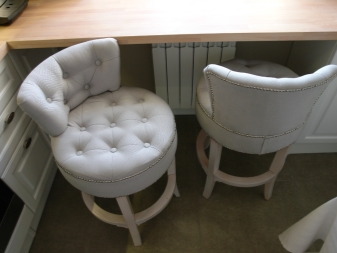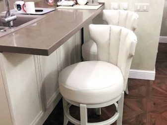 There are bar stools with seats of various shapes: round, triangular, square - it all depends on the personal preferences of the owner. In some designs, the back is provided, in others - not. Here it is necessary to take into account the frequency of use of furniture, the need for it to slide under the rack. If the chairs along with the counter play the role of a complete dining area, then it is better to give preference to products with a back and armrests. Folding models are suitable for a small kitchen - they take up minimal space and are easy to use, but their shortcoming is short life.