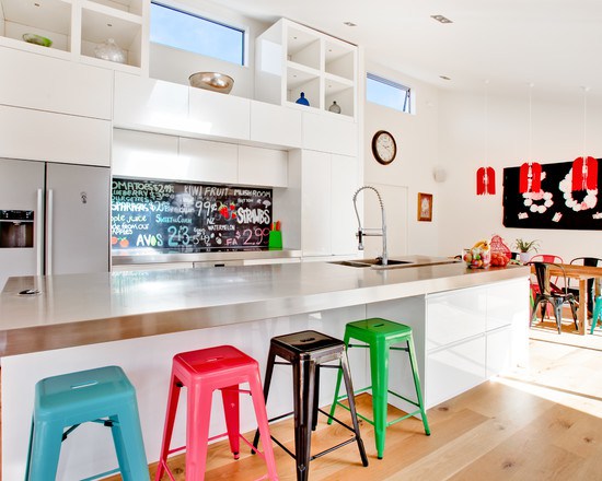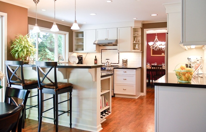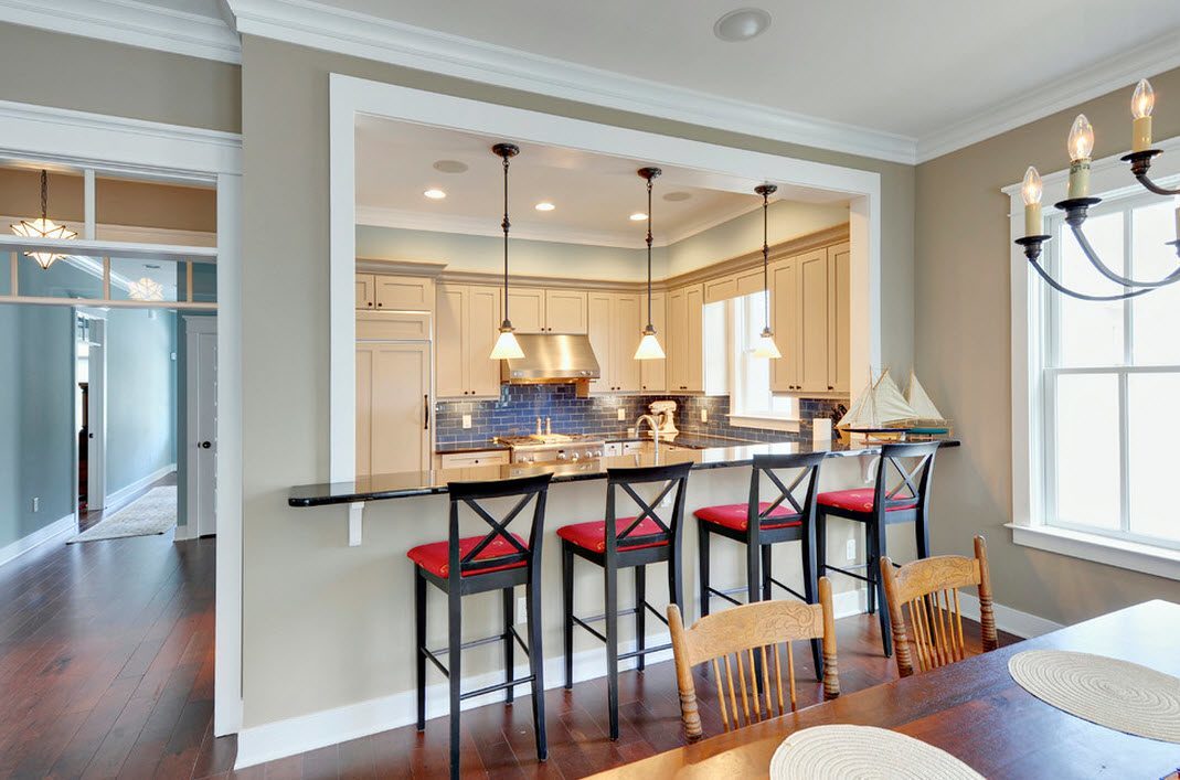 When in a small apartment it is necessary to separate the hall from the kitchen, racks from 100 to 130 cm are used. If the height of the rack is 120 cm, then the bar stool should be 90 cm high or several centimeters more. It all depends on the height and size of a seated person. When the tabletop is at the level of 100 cm from the floor, then a suitable chair height is 70-75 cm.