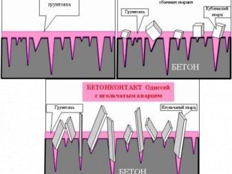 Concrete-contact solutions are available in two fractions: 0.3 mm and 0.6 mm. The first option is used when preparing the surface for puttying, the second - before plastering. The composition includes quartz, depending on the size of which this or that type of fraction is indicated. It is worth noting that there are two types of quartz in concrete contacts: needle-like and ordinary.