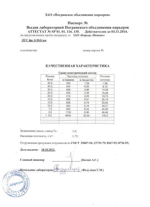 For high-quality performance of work it is necessary to acquire inorganic rocks that meet all quality standards. Construction companies engaged in the extraction and sale of the CBC, must have documents for each batch of material with the following data: