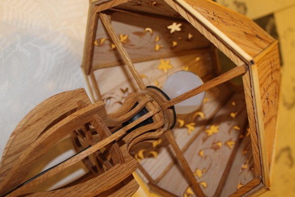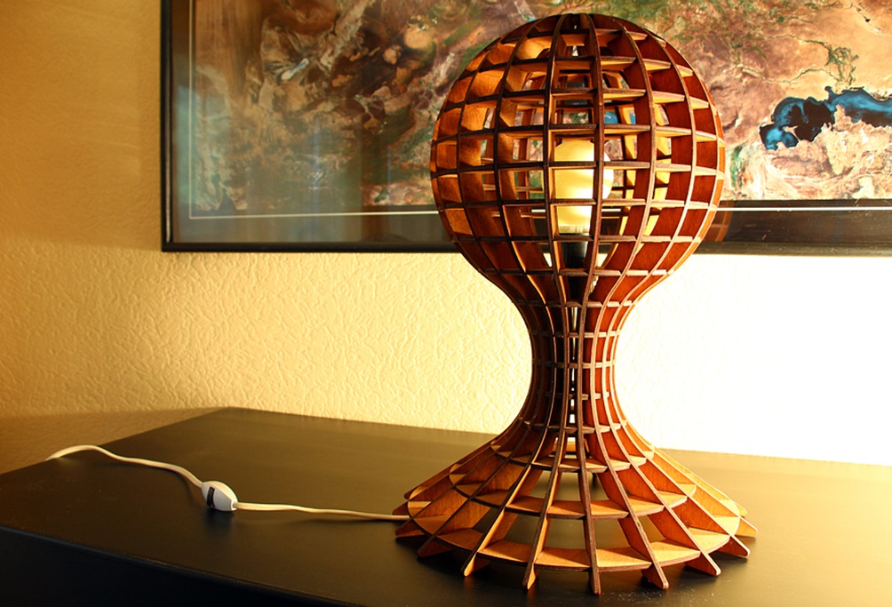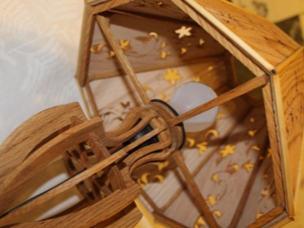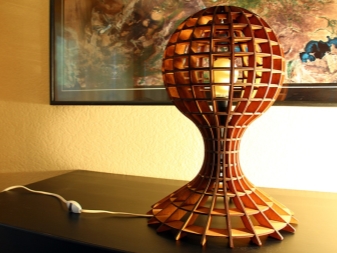 - Wood. These lampshades are made of solid thin wood, where the pattern is cut, or from narrow wooden slats, which are well fixed to each other. Such table lamps on a leg will look good.