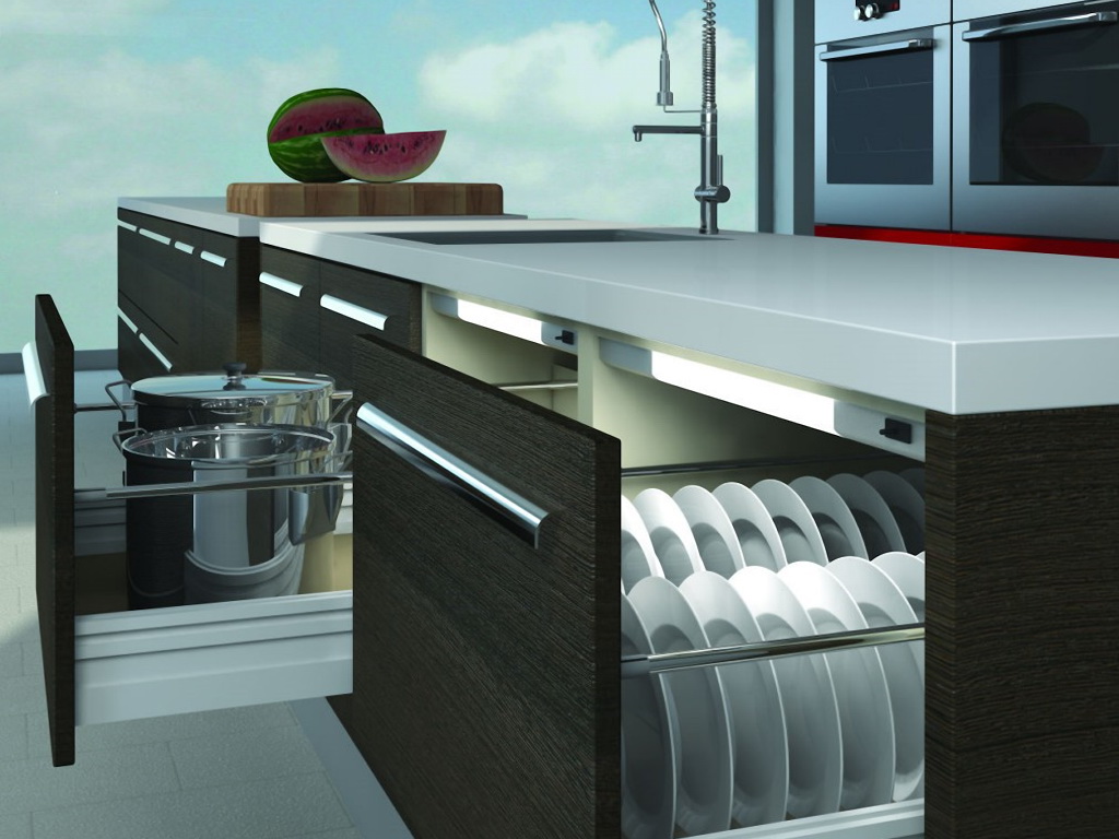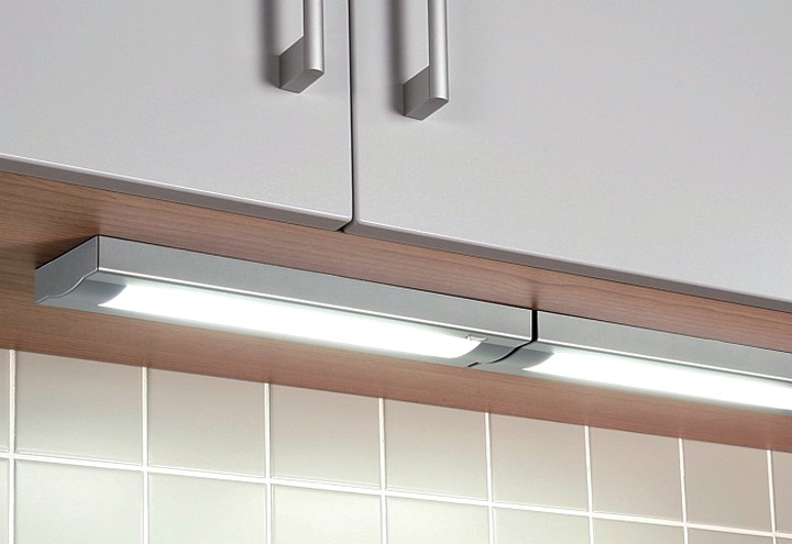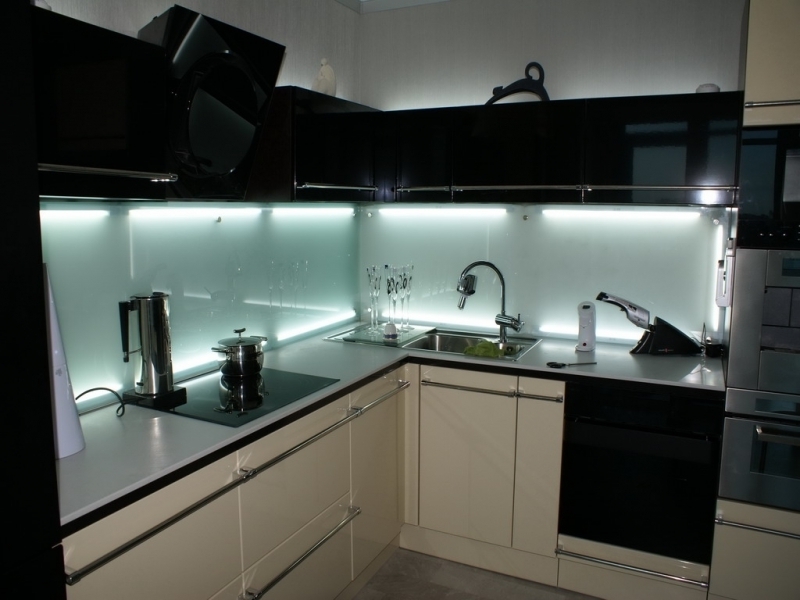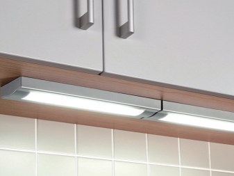 - Corner Lighting can be built into the joint between the wall and the ceiling in the form of a structure similar to the ceiling plinth. This design includes several small lamps of the same model and size. This type of luminaire is often chosen for the kitchen, the luminescent model is installed on the tap between the wall and the lower part of the cabinet, illuminating the work surface.