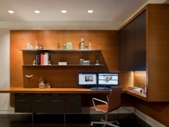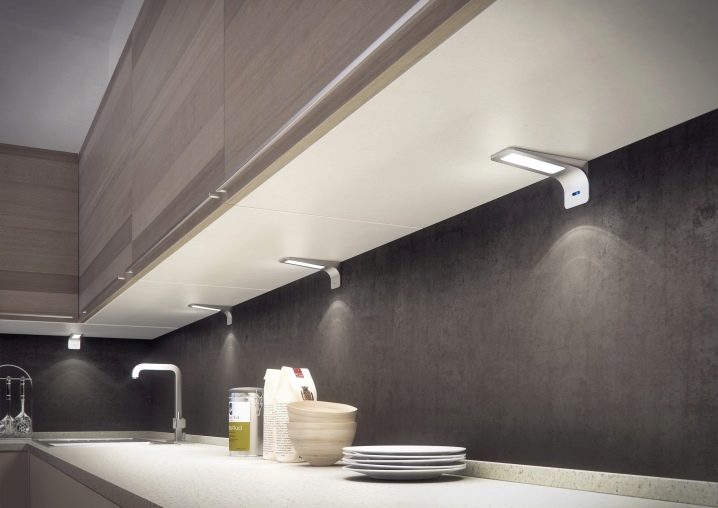 Among the built-in and overhead types of lamps are often found round models. They can be located in the headset, highlighting certain parts of it. Sometimes fluorescent lamps mounted in the design for the shelves.