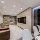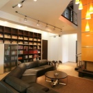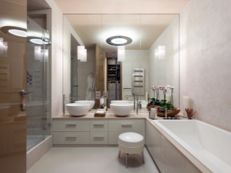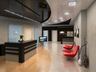 Also in many spacious halls with high ceilings, spotlights are used as double light sources. The main lighting device in this case is a large chandelier, it is placed in the center of the ceiling. LED lamps also are located at the edges from it at an equal distance.