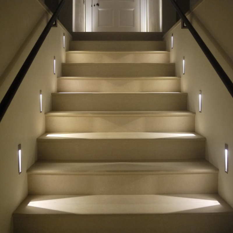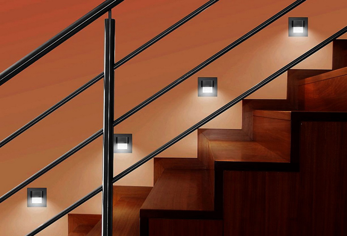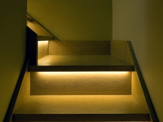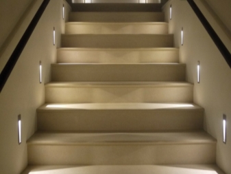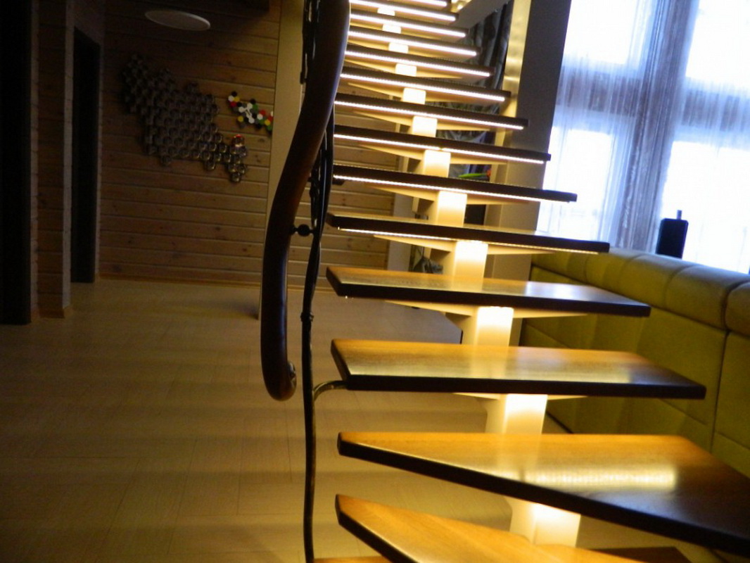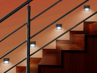 Also now very often spotlights of the surface type are used to illuminate the stairs. And most often they are equipped with a motion sensor. That is, when you climb the stairs or approach it, they will light up themselves. This is a very convenient solution that will protect your ascent and descent along the stairs. They are also installed on the railing of the stairs and even between the steps, it is interesting to play with the illumination of this zone.