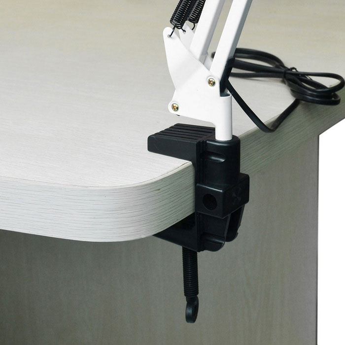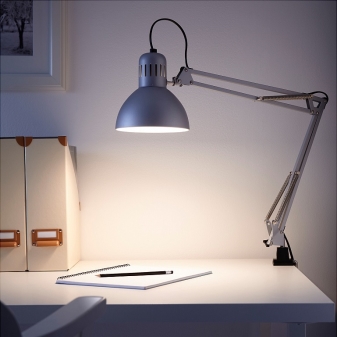 Almost always, a desk lamp with a mount has a switch on the pole or power cord. Expensive models are made with a brightness adjustment mechanism.Because of this, there is a reduction in energy consumption and, consequently, a reduction in fees for it. And thanks to the smooth start-up increases the durability of the entire structure.