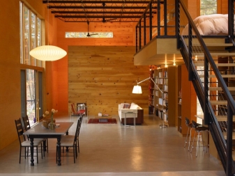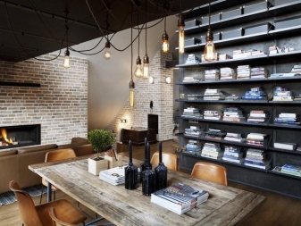 Suspended lamps in this style are often characterized by extreme simplicity. The lamp should be concise, monotonous, even slightly rough. Often, ceiling fixtures are attached to iron beams or hang on fairly massive chains of metal or steel. It looks impressive and very stylish.