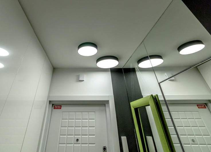 Small round pivoting spots are most often used to illuminate the desktop in the kitchen, hallway, to illuminate shop windows, etc. The flat lighting equipment of a flat configuration is mainly located on the ceilings. Such lamps are small and convenient because they do not cause difficulties when mounted. Their advantage is that they are closed with comfortable shades.They are suitable for the bathroom, hallway, corridor and other passage rooms.