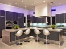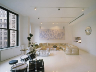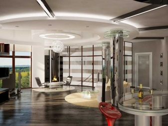 Halogen lamps play an indispensable role in design rooms. in high-tech style. In addition to ceilings, lamps are installed on walls, in furniture, in arched aisles, in partitions between rooms, and so on. Sometimes in the bedrooms you can find a light panel, which creates an optical illusion of the second window.