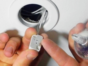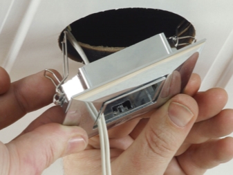 If the hole is made, you can lay the wire. Then you can install the luminaire itself. It is fastened at the expense of special antennae clamps with springs, which must be brought together and the lamp inserted into the cut out beam, after which they disperse, fixing the lamp. (For convenience, you can fasten the antennae together with a special wire, which is subsequently cut with forceps in the ceiling).