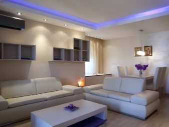 Lamps, located in the form of a beautiful geometric shape in the children's room, are able to create an atmosphere of a real fairy tale. The living room will look great halogen spotlights in combination with the main chandelier. Having illuminated the walls with a muffled, directed spotlight in the hallway, thus removing the ceiling, you can visually expand the corridor space. Spotlights in the bathroom look very impressive. A soft, not very bright light of 3-4 bulbs will be quite sufficient to illuminate a small bath.