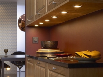 Furniture fixtures are those models that are built into cabinets and all sorts of furniture to illuminate the shelves. Such lamps are distinguished by the fact that the heating of the armature is reduced on the demand of fire safety equipment. Even in a chipboard 18 mm thick, you can embed a lamp of this type, which is a big plus and makes it possible to bring something unusual into the design of the room.