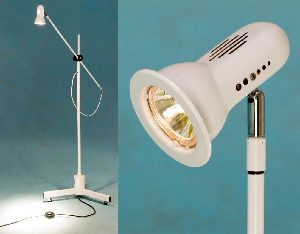 Halogen floor moving lights are commonly used to equip medical offices. The floor lamp itself has a flexible bracket connection with the base, as well as a convenient movement function on silently working wheels.