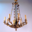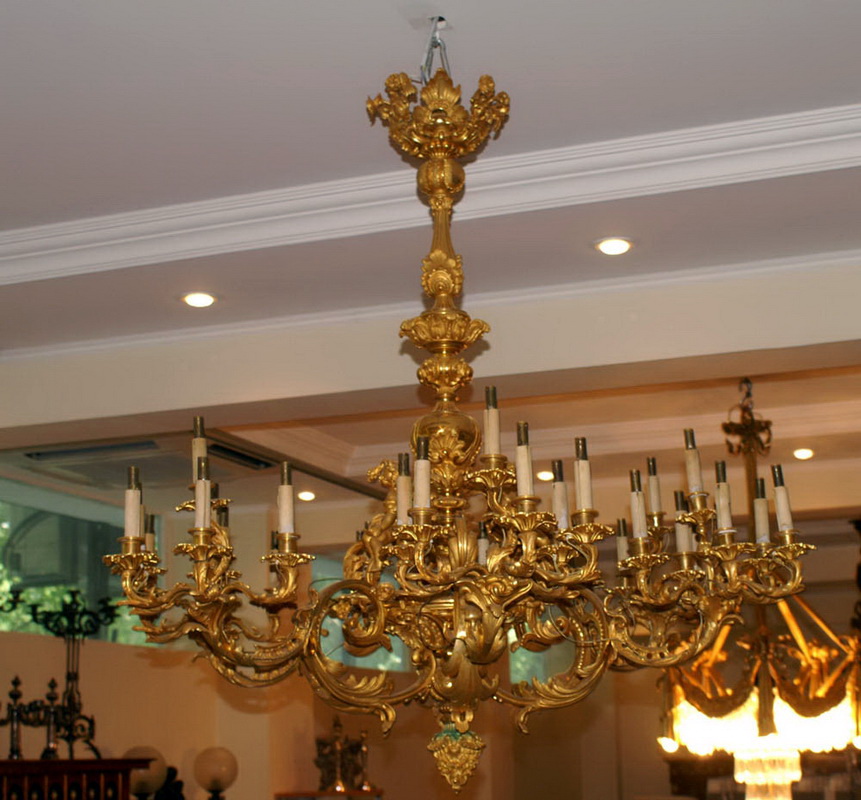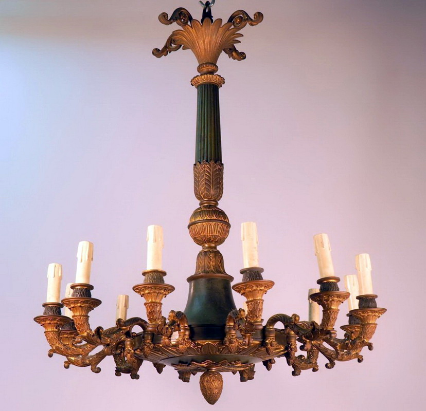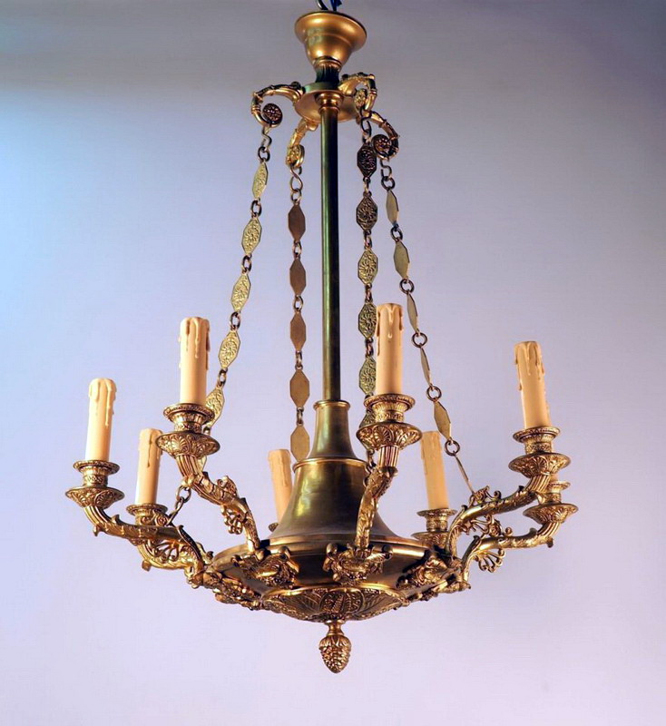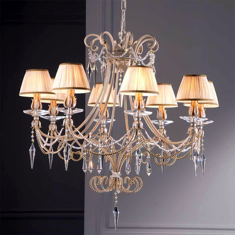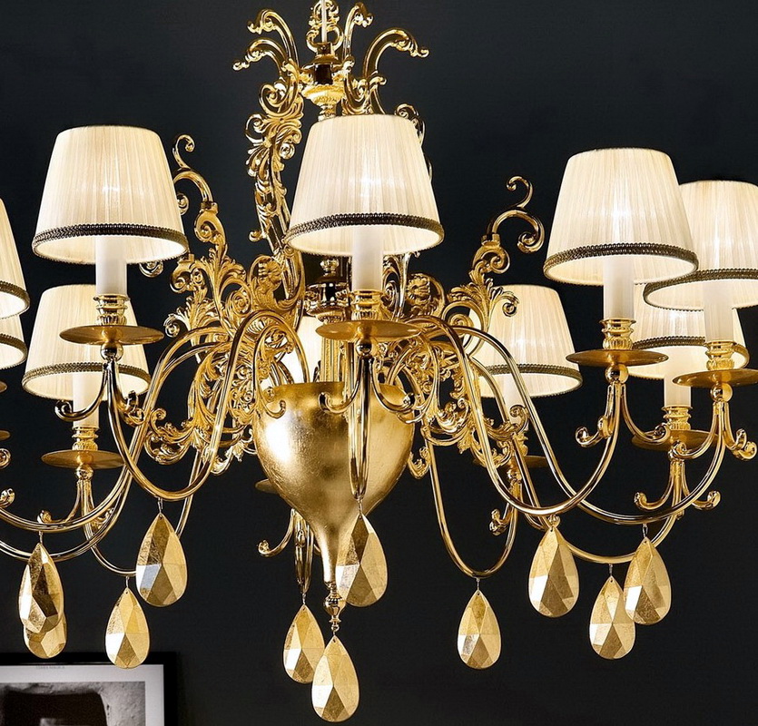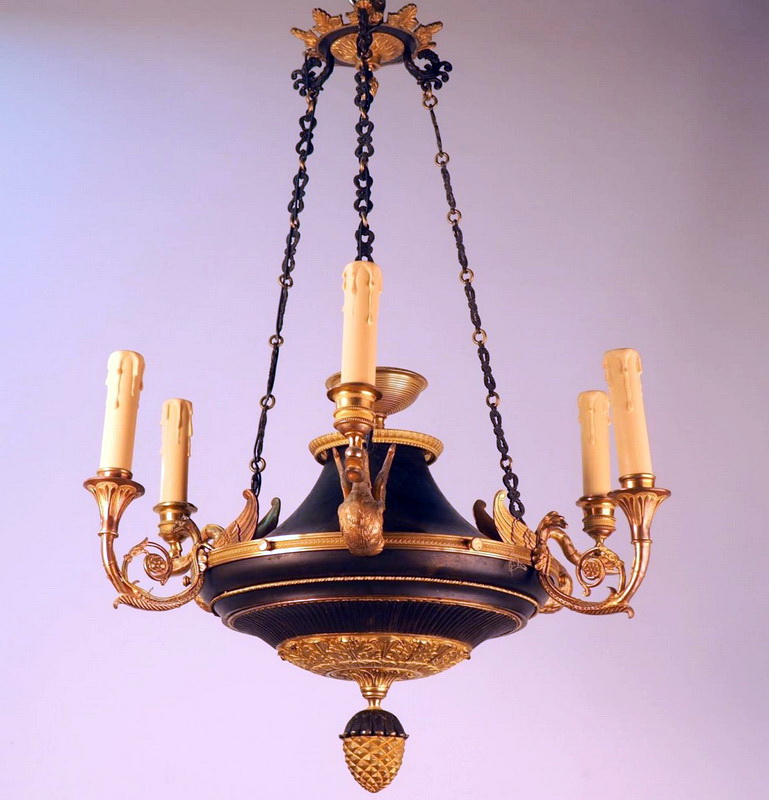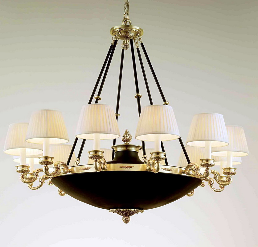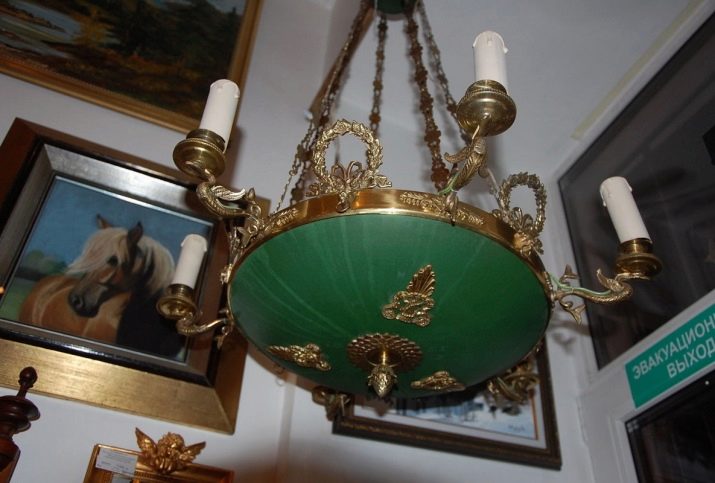 Lighting devices of this style are called nothing but as pompous luxury with classics. Ceiling lamps for such lamps are correct, one can say graceful. As a decoration, military motifs, such as bay leaves or eagles, are often used. Base metal - bronze or gilding. Crystal pendants are used as additional decorations.