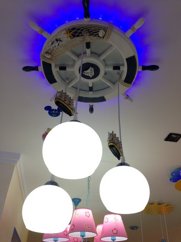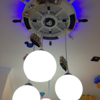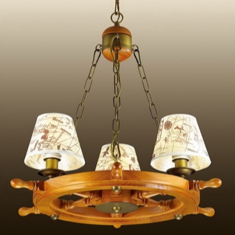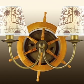 Thematic lamps in the marine style, one way or another, will be associated with water, and, more precisely, with the sea or ocean. These lights can be placed anywhere, not corny, they will look in the nursery. Just imagine how beautiful the glowing anchor or the steering wheel looks. To create such chandeliers and lamps, natural materials are most often used, but the base can be made of wood. And everything else is supplemented with decorative ropes, ropes and sacking.
