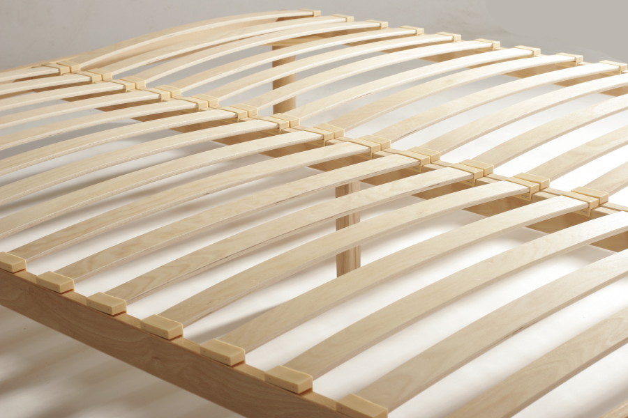 The base for the mattress can be made of plywood slats, curved upwards. They are made from steamed veneer. This element is connected to the frame using rubber or polymer fasteners, which ensures their mobility.