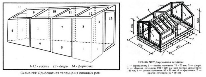 As already mentioned, there is no clear size of the greenhouse from the window frames, it all depends on the desire of the developer and the volume of crops that I would like to care for.In this article, only proposed generic typical sizes of such greenhouses. The image below shows the optimal dimensions for a greenhouse with a roof and a laid foundation. Immediately it should be said that the installation of any economic structure requires the development of an individual drawing, which would reflect not only the basic values of the building, but also the stages of work on the foundation, frame and the whole structure as a whole. The drawing will help to properly allocate resources and materials and, with proper assessment and marking of the future structure, will ensure the entire greenhouse with integrity and durability.