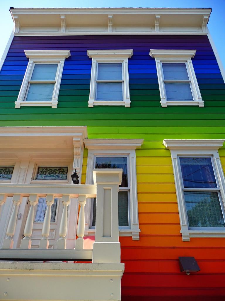 Facing the facade of the house, made in bright colors, in perfect harmony with the dark elements: railings, window frames, street wrought lamp.