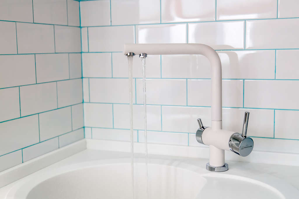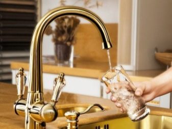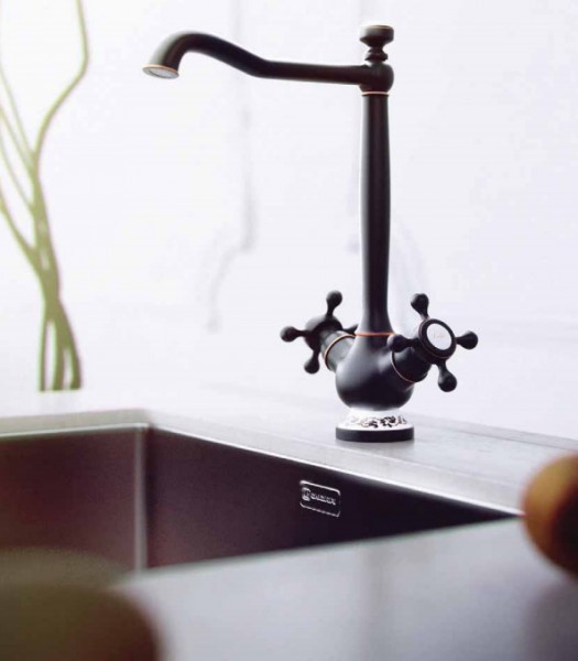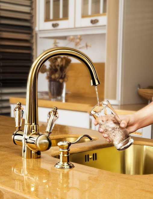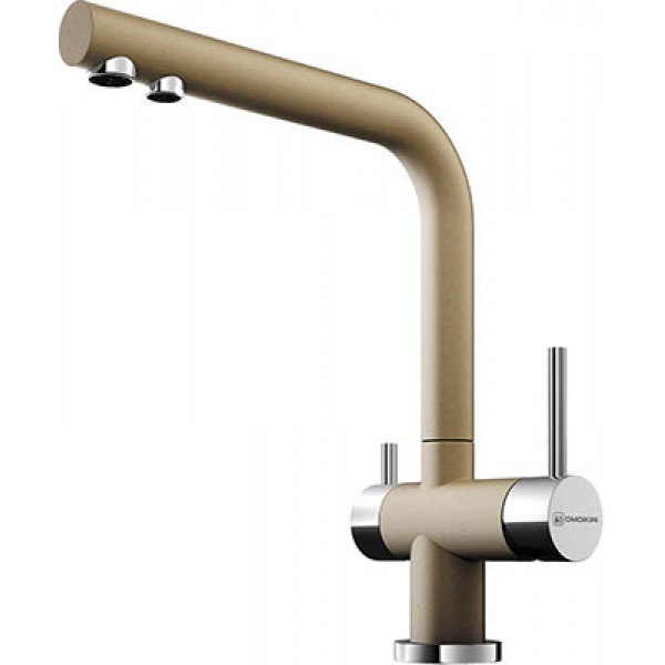 The faucet is made of brass and is suitable for both the kitchen and the bathroom. Spout high - 294 mm. The choice provides a large number of colors, among which you can choose not only the color, but also the texture of the crane - smooth, grooved, matte. The crane has two outlets for water, one of which is configured as filtered water, and two lever handles.