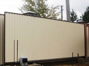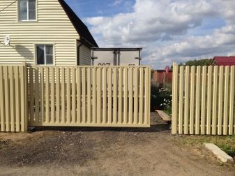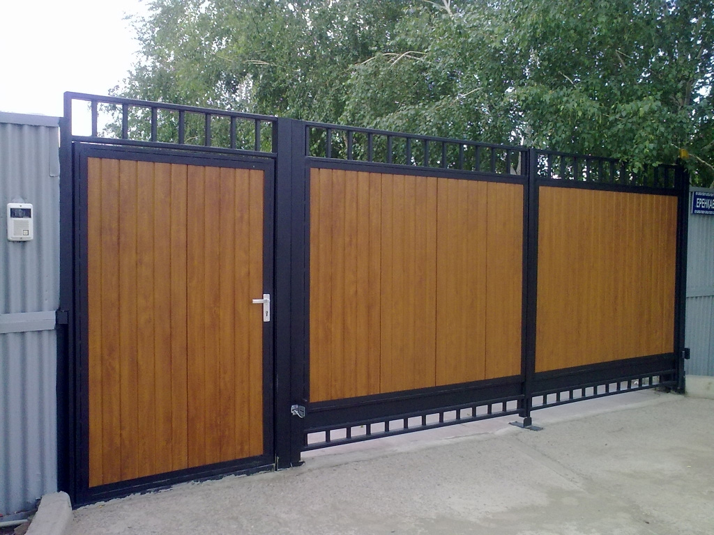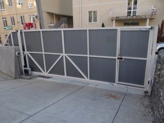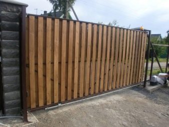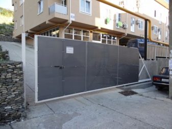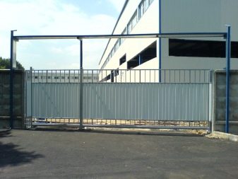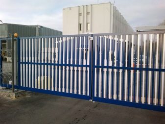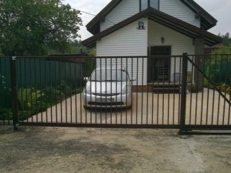 Often this kind of sliding gates installed in the private sector. They are held in open form by means of a metal frame.In this case, the sash can be open or closed, and through the blind canvases will not be viewed the territory of the site.